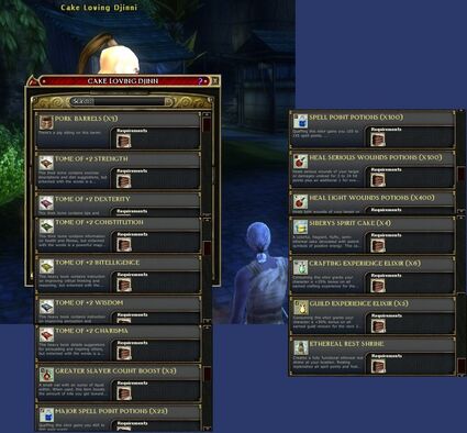 Summons Cake Loving Djinni who opens up barter UI, to turn in the cake itself for various DDO store items: